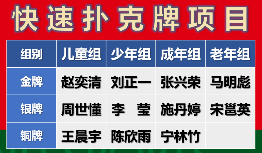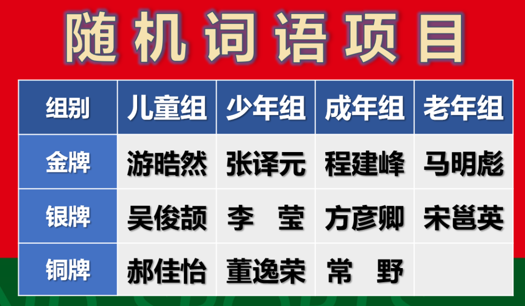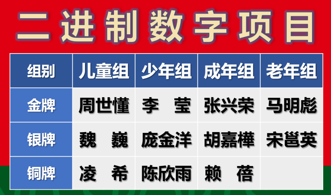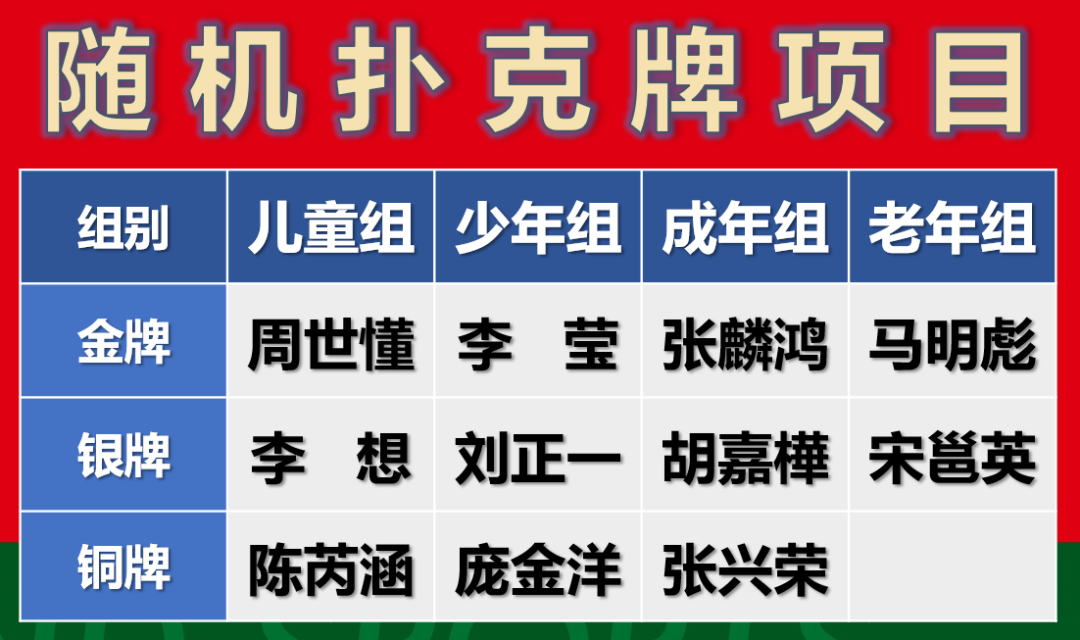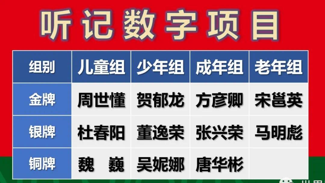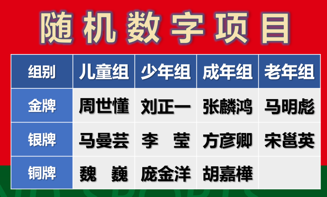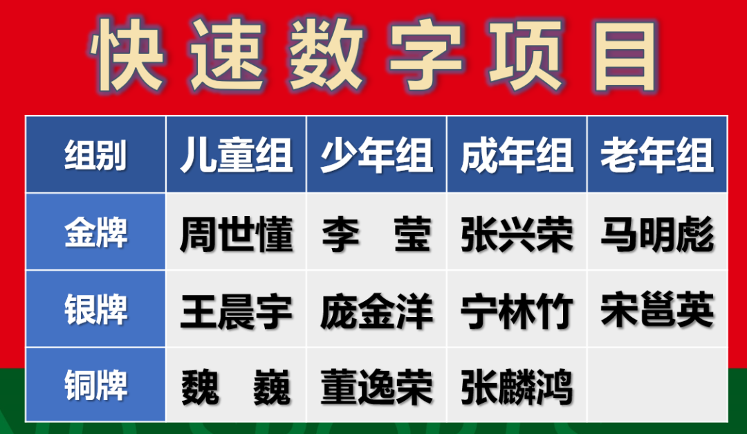 经过3天的激烈比拼,李莹获得了本届亚洲记忆运动会总决赛全场总冠军,张兴荣获得了全场总亚军,张麟鸿获得了全场总季军。